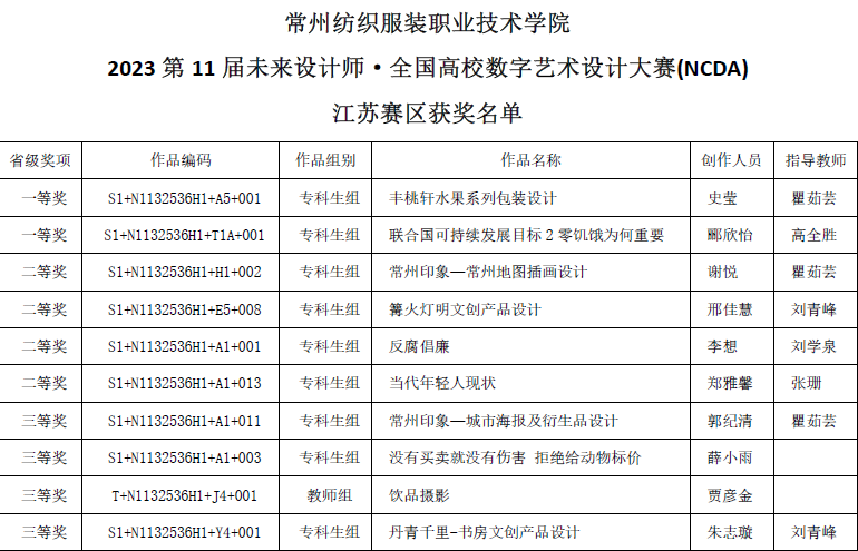 近日,由工业和信息化部人才交流中心主办的第十一届未来设计师·全国高校数字艺术设计大赛(NCDA)获奖名单公布,创意公司师生作品在1826所参赛高校的近29万件作品中脱颖而出,共获国赛奖项2项,其中,获得一等奖1项、三等奖1项;另外在省级赛中,获得一等奖2项,二等奖4项,三等奖4项。
