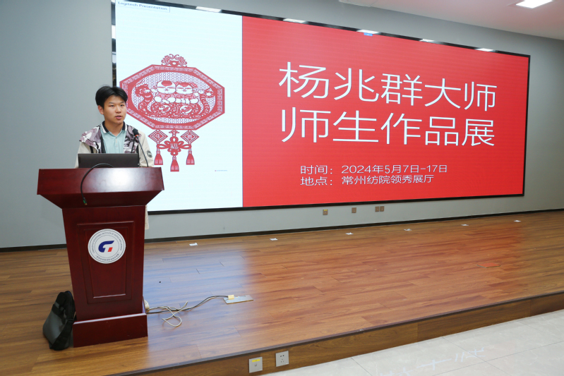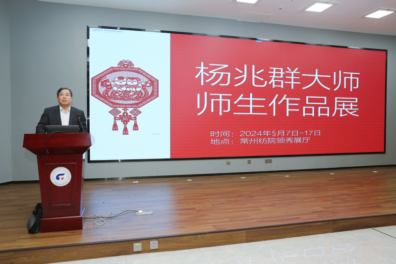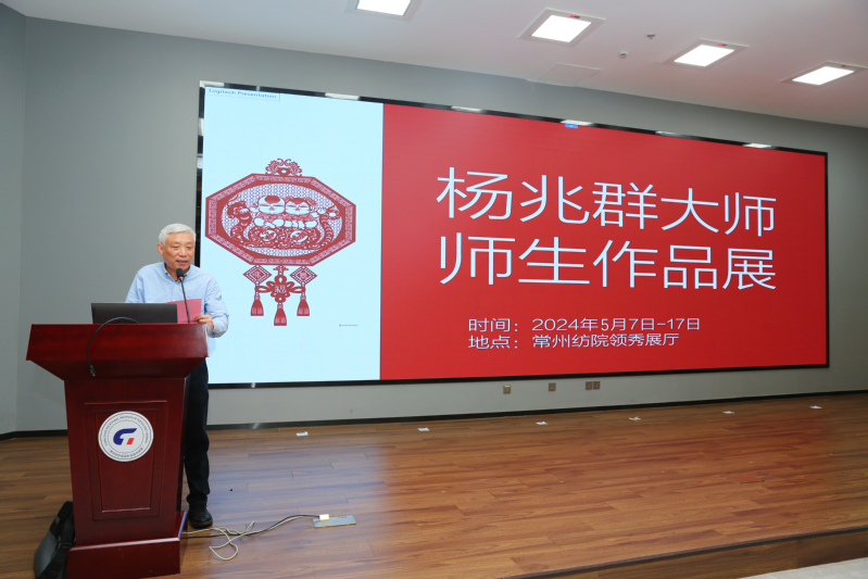 杨兆群大师介绍了中国剪纸的历史传承,他强调:民间剪纸作为一种依附于民间生存形态的活态文化传统,承载着丰富的文化内涵,是我们民族文化传承的重要载体。金坛刻纸作为中国剪纸的重要组成部分,更是代代相传的智慧和创造的结晶,同时也是地方文化软实力的重要体现。同时,他也表达了深切的期盼,希望今后与常纺院共同致力于推动金坛刻纸的传承与创新,希望能有更多的优秀师生结合自己的专业知识,积极参与到非遗的创作创新中,让非遗技艺焕发出新的生机,让非遗文化得以生生不息地传承下去。