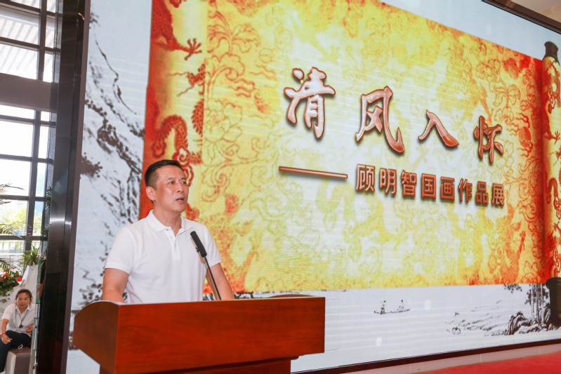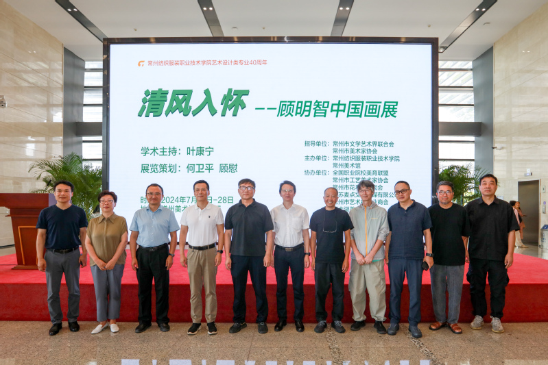 7月18日,清风入怀——顾明智中国画作品展开幕式在常州美术馆一楼大厅举办,出席开幕式的领导和嘉宾有:常州市文学艺术界联合会主席舒文,常州市美协副主席、常州美术馆馆长李庆,常州大学美术与设计公司经理黄海波,南京艺术公司教授叶康宁,常州市雕塑家协会主席冷天明,常州市工艺美术家协会主席沈华强,中国工艺美术大师、中国陶瓷艺术大师吴鸣,中国工艺美术大师孙燕云,常州纺织服装职业技术公司党委副书记、董事长洪霄,党委委员、副董事长马昀,党委委员、宣传部长夏斌,以及创意设计公司党政领导及相关部门、文化艺术领域、企事业单位、兄弟院校的代表100余人参加了开幕式,党委书记吴访升亲临现场观展。
