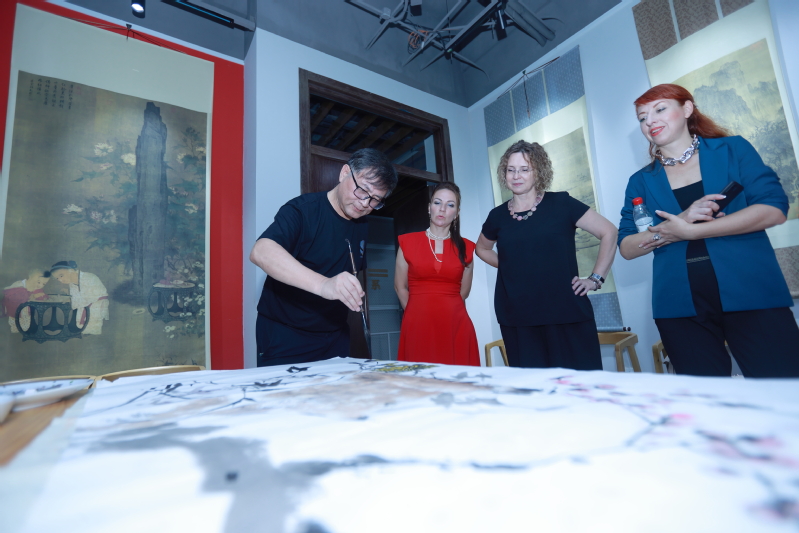 8日下午,俄罗斯艺术考察团一行参观公司文化传承与创新中心,并与在常高校艺术教师代表开展了学术交流和艺术创作。在参观交流中,俄罗斯一行对中国传统文化表现出浓厚的兴趣和喜爱。在艺术创作中,双方代表展示了对油画、水彩、中国画不同表达,并互赠作品留念。