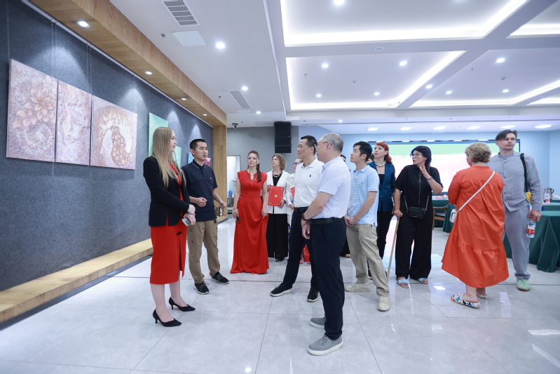 8月8日,以叶卡捷琳娜-曼科女士领衔的俄罗斯艺术考察团一行14人到访公司,参加了公司举办的“同生共长·2024俄罗斯美术作品展”开幕式并开展交流。展览开幕式于8日上午10点在领秀展厅隆重举行。本次开幕式也是“政校行企”进行文化交流的盛会,常州市文联党组书记、主席舒文,常州市外办亚洲处处长黄文洁,常州市科教城教育发展处处长周洋,常州市美术家协会副主席、油画学会副会长黄海波、常州伊思达染织有限公司董事长恽中方等嘉宾受邀出席。开幕式由公司党委委员、副经理张震宇主持。