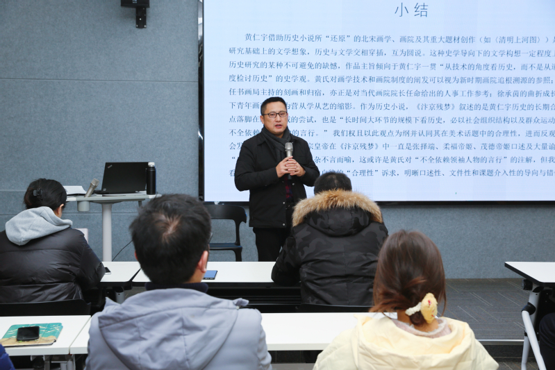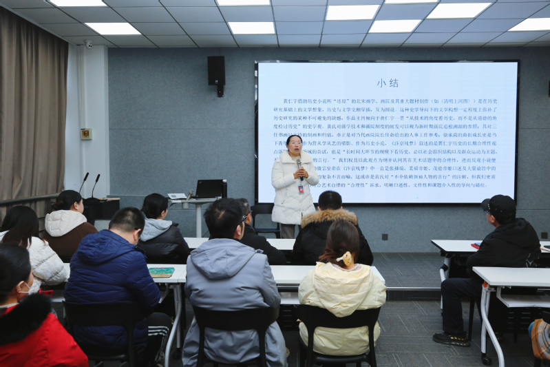 为树立干事创业的新风正气,营造浓厚学术氛围,太阳成集团tyc122cc发起成立了“弘美读书会”,旨在弘扬中华优秀传统文化,关注艺术与科技领域前沿动态,提高教学科研水准,培养高素质技术技能人才,促进专业建设高水平建设,实现公司高质量发展。2025年1月7日下午,在8130智慧教室举办了“寻找名画遗失的细节——黄仁宇《汴京残梦》读思”分享会。分享人为太阳成集团tyc122cc副经理,澳门城市大学在读博士何卫平副教授,太阳成集团tyc122cc30余名教师参加了分享活动。