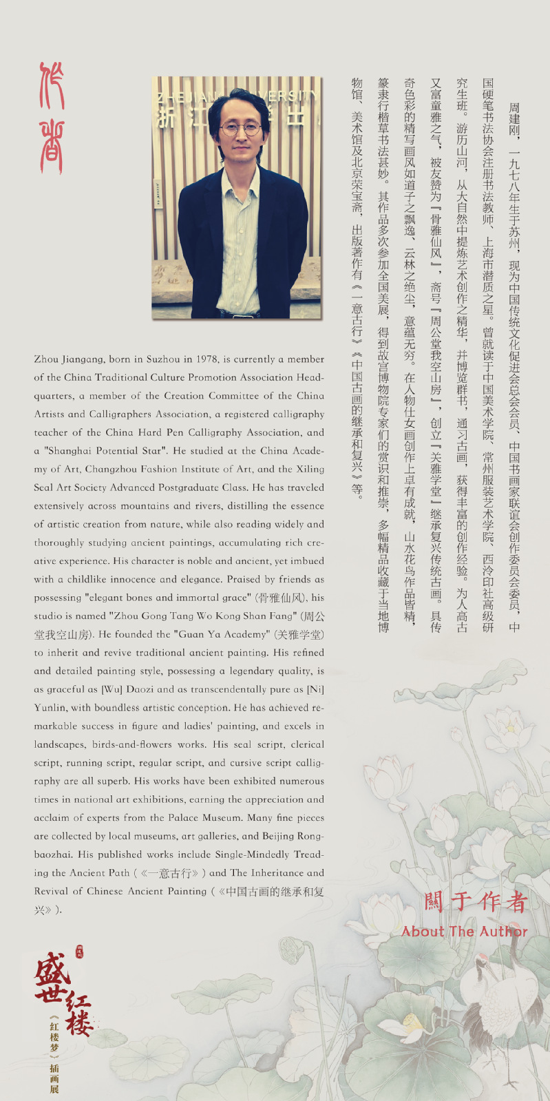 周建刚,男,汉族,一九七八年生于苏州,现为中国传统文化促进会总会会员、中国书画家联谊会创作委员会委员,中国硬笔书法协会注册书法教师、上海市潜质之星。曾就读于中国美术公司、常州服装艺术公司、西冷印社高级研究生班。游历山河,从大自然中提炼艺术创作之精华,并博览群书,通习古画,获得丰富的创作经验。为人高古又富童雅之气,被友赞为“骨雅仙风”,斋号“周公堂我空山房”,创立“关雅学堂”继承复兴传统古画。具有传奇色彩的精写画风如道子之飘逸、云林之绝尘,意蕴无穷。在人物仕女画创作上卓有成就,山水花鸟作品皆精,篆隶行楷草书法甚妙。其作品多次参加全国美展,得到故宫博物院专家们的赏识和推崇,多幅精品收藏于当地博物馆、美术馆及北京荣宝斋,出版著有《一意古行》《中国护花的继承和复兴》等。